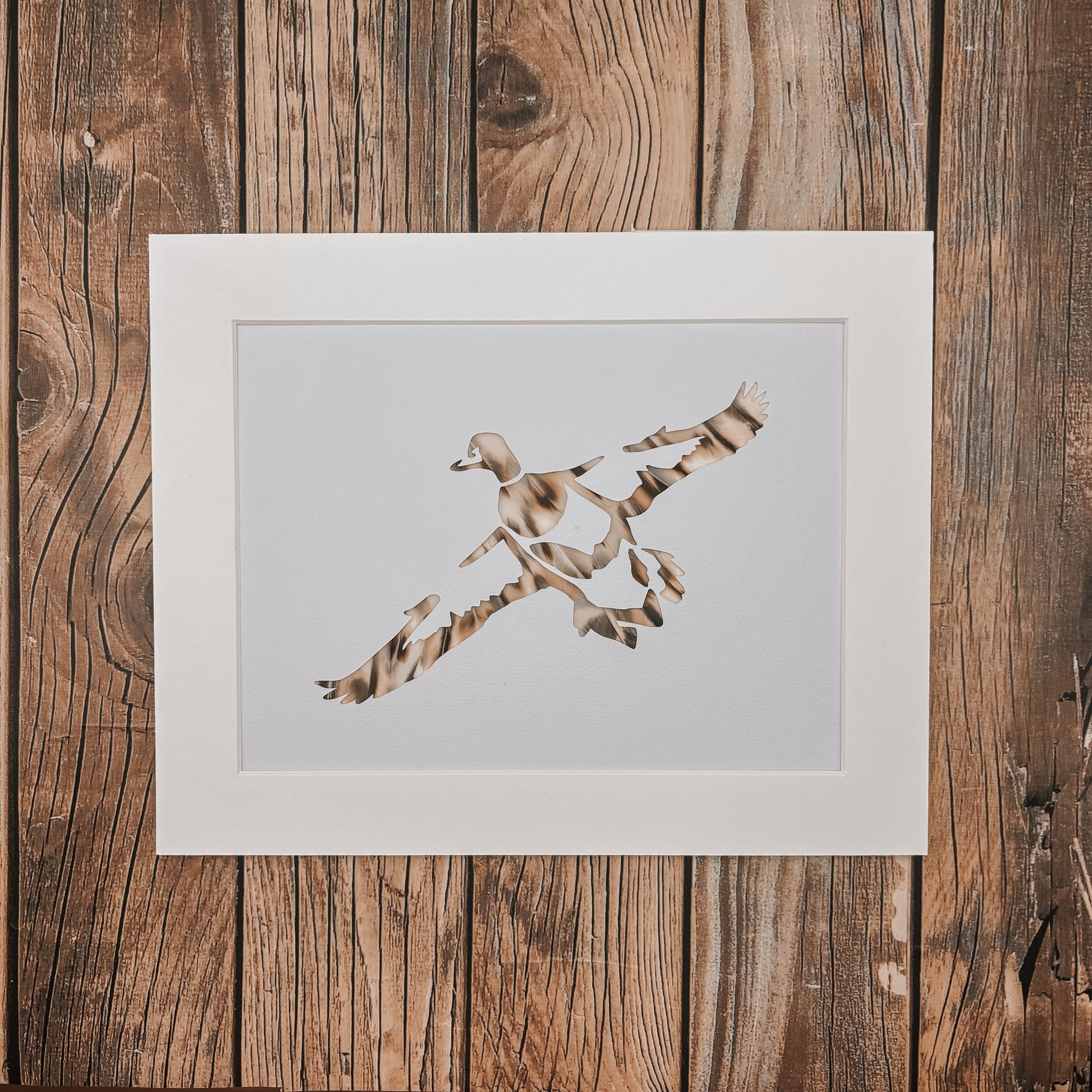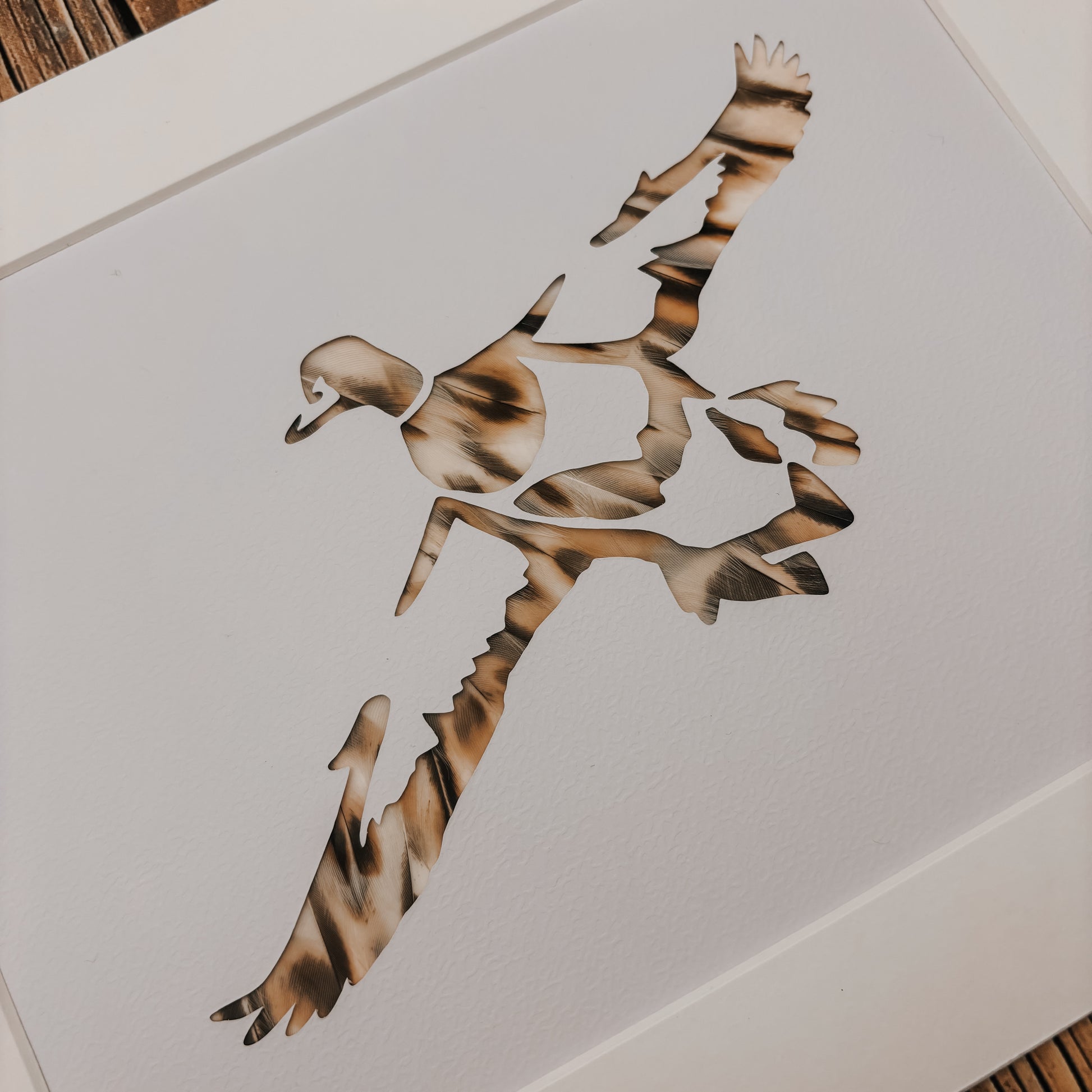 This piece is backed with subtle soft brown hen duck feathers. All out artwork will be mounted with a white mount as standard. If you would prefer a different mount colour, please contact us to check availability before ordering.